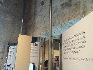 Una gran fotografia de Pedrolo, amb un somriure que endolceix la cara ferrenya, ens dóna la benvinguda i, prop del sostre, un lema dóna sentit a una obra i a una vida: la voluntat de ser lliure. Des de l'opressió, des de la consciència de ser  un presoner hi ha el desfici de saltar límits, de fugir dels murs que oprimeixen.